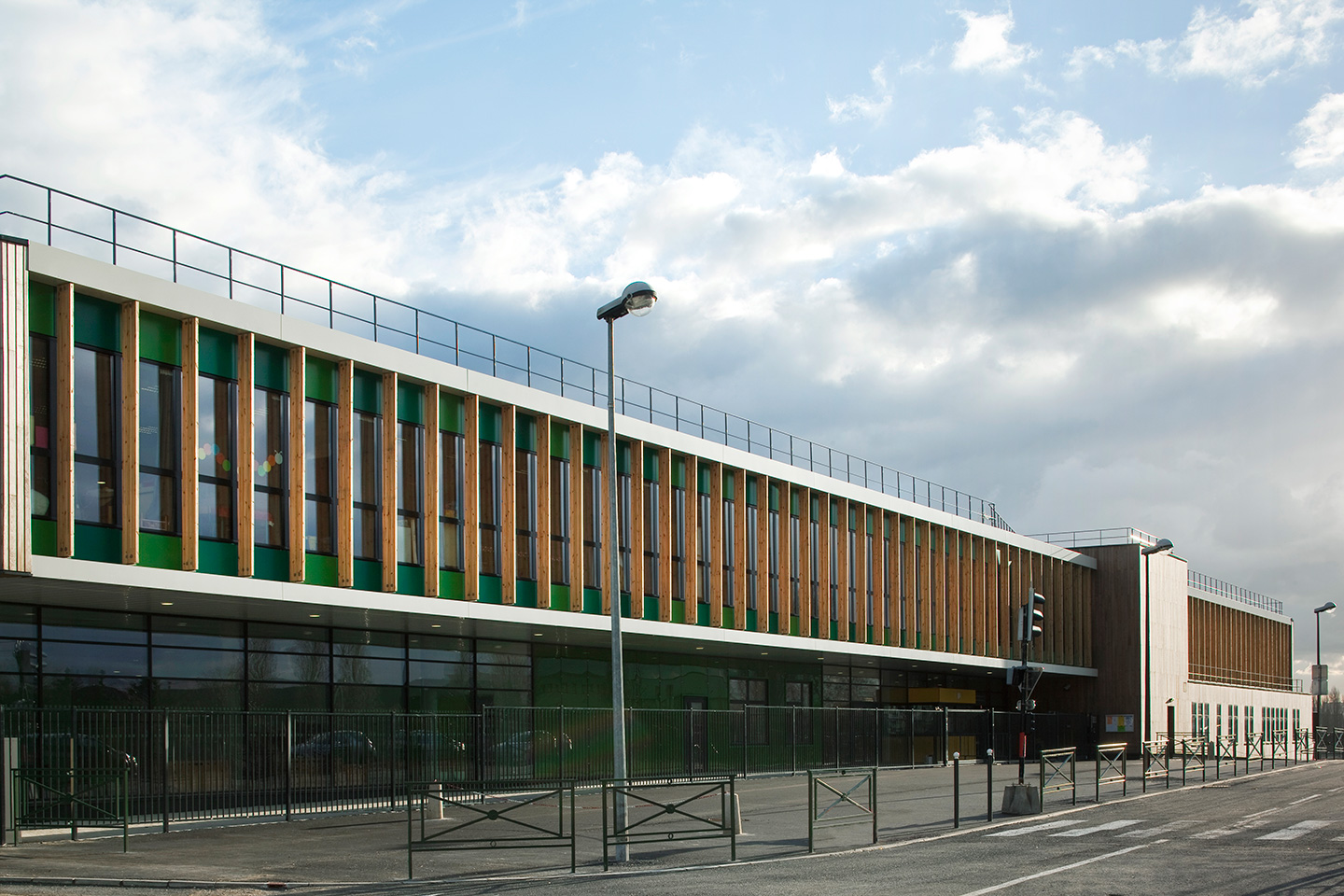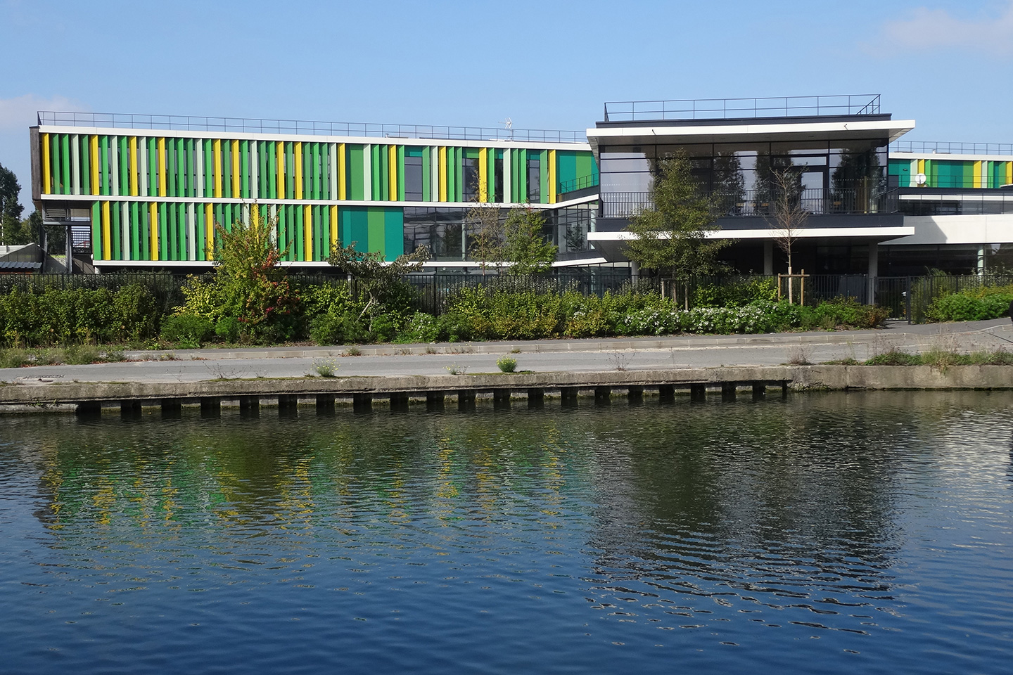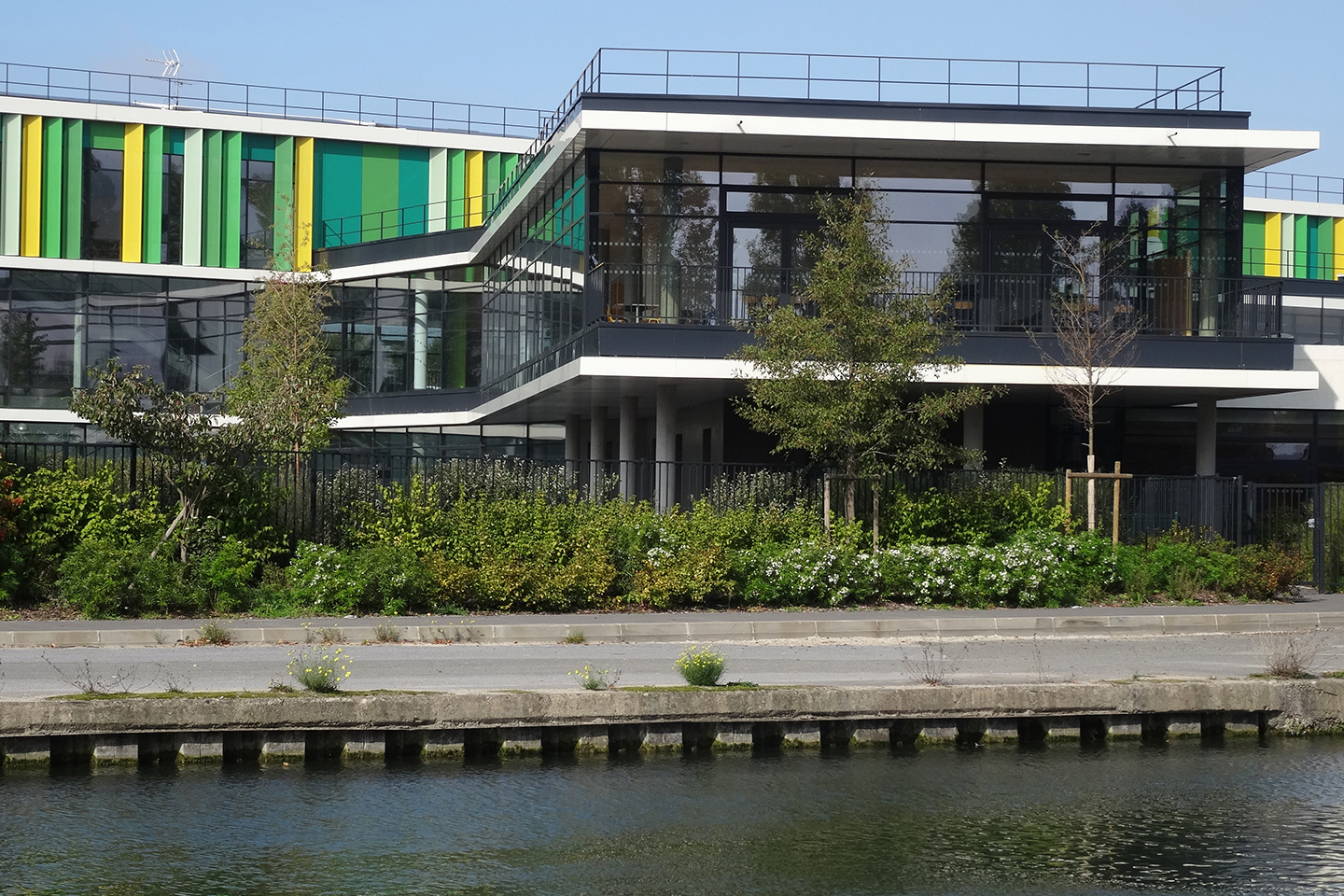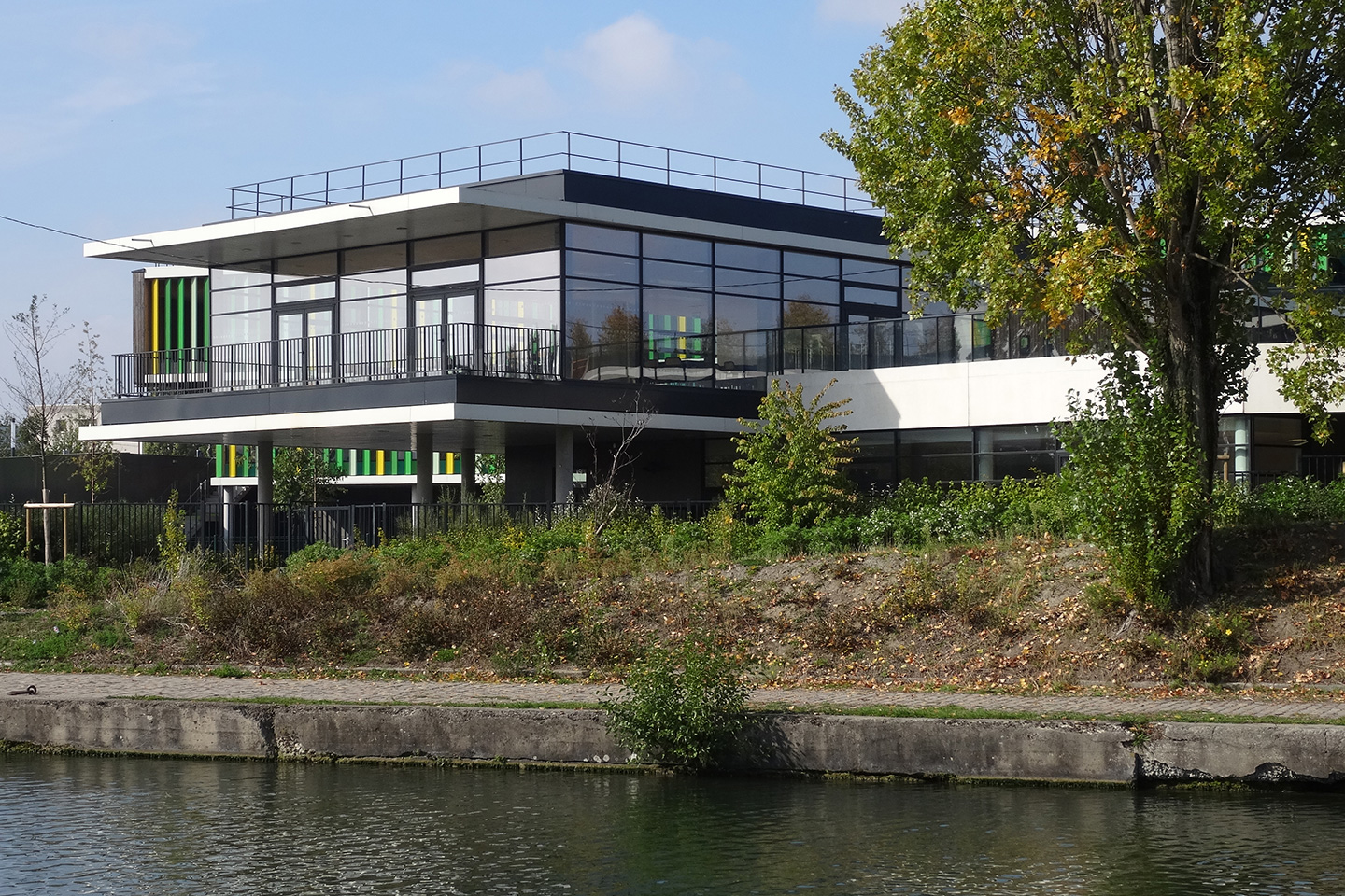 Description > Installée au bord du canal de lOurcq, lécole Jules Verne fait la part belle aux grands horizons, prenant vocation de signal dans un paysage dexception. Lensemble des espaces intérieurs profite de cette situation, notamment les espaces de restauration en belvédère sur le canal.