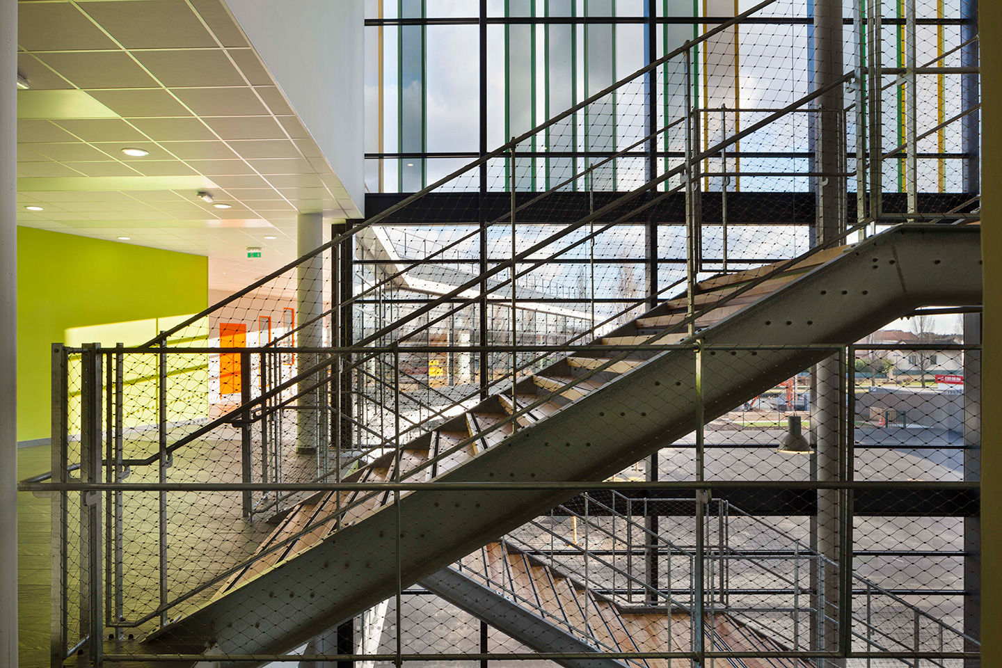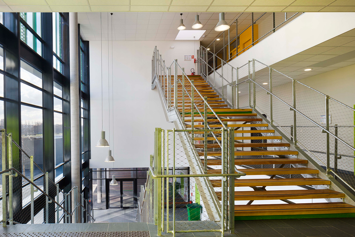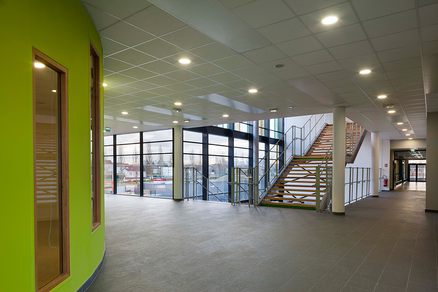 Description > Installée au bord du canal de lOurcq, lécole Jules Verne fait la part belle aux grands horizons, prenant vocation de signal dans un paysage dexception. Lensemble des espaces intérieurs profite de cette situation, notamment les espaces de restauration en belvédère sur le canal.