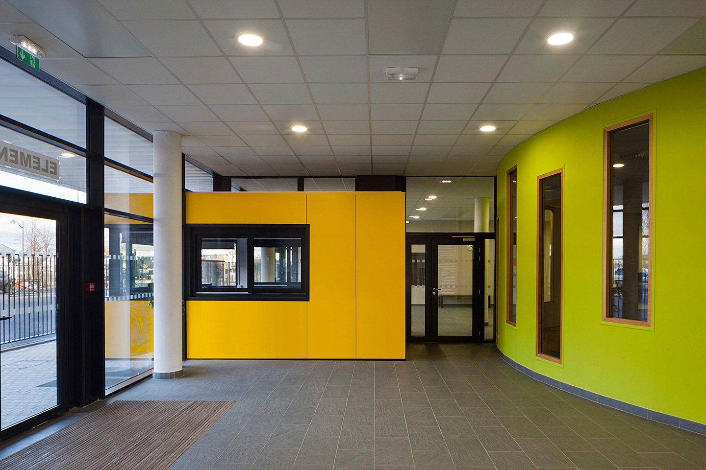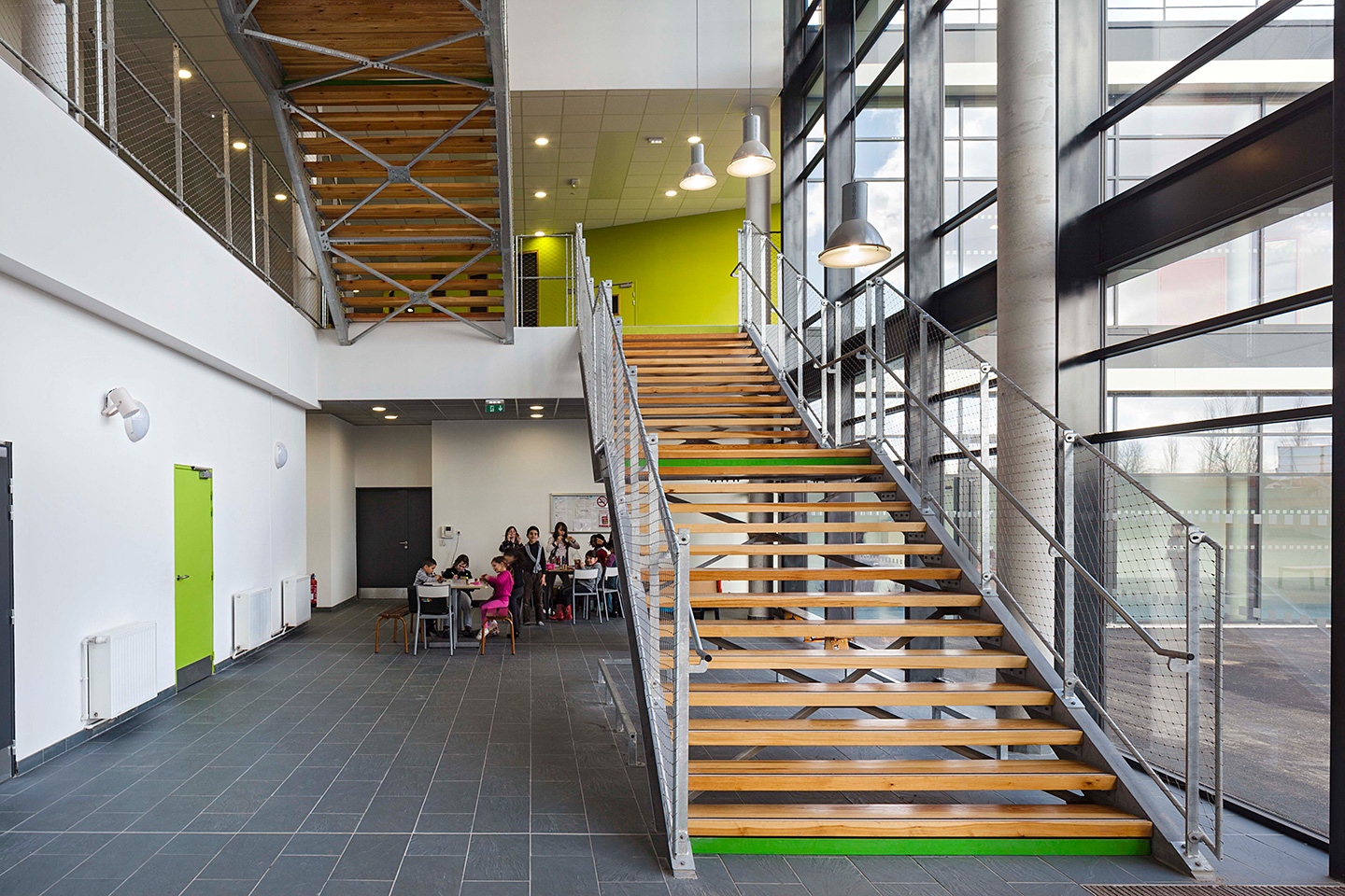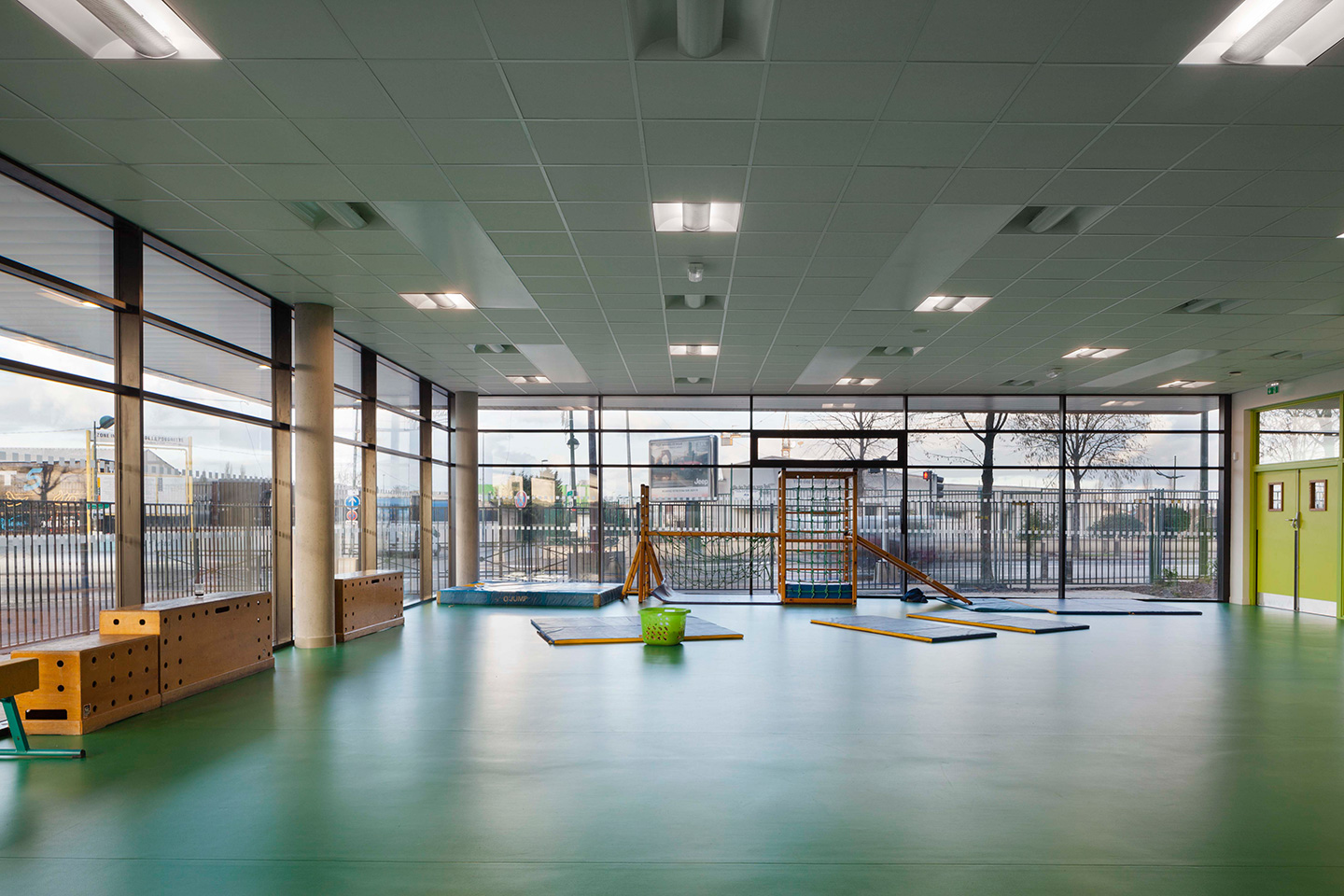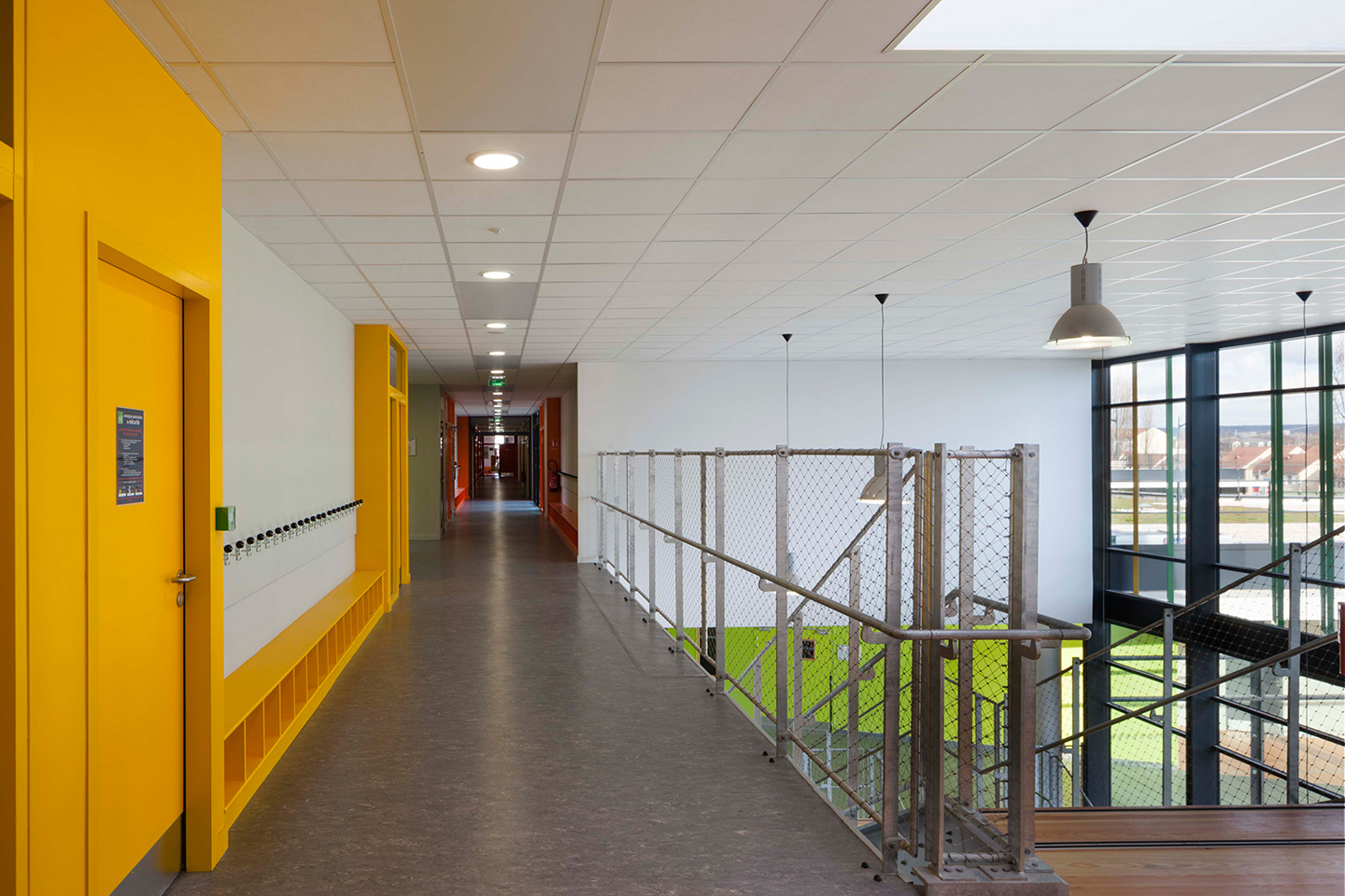 Description > Installée au bord du canal de lOurcq, lécole Jules Verne fait la part belle aux grands horizons, prenant vocation de signal dans un paysage dexception. Lensemble des espaces intérieurs profite de cette situation, notamment les espaces de restauration en belvédère sur le canal.