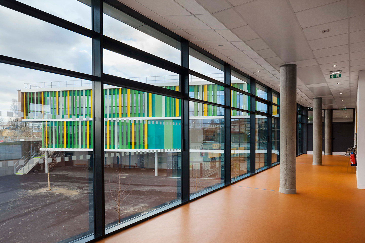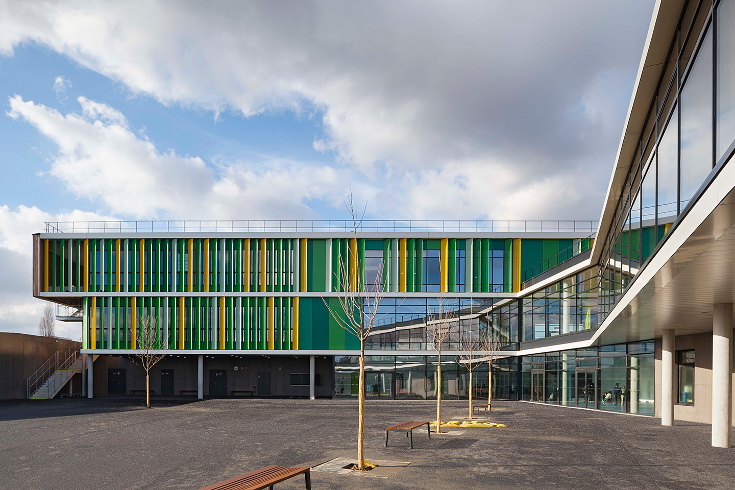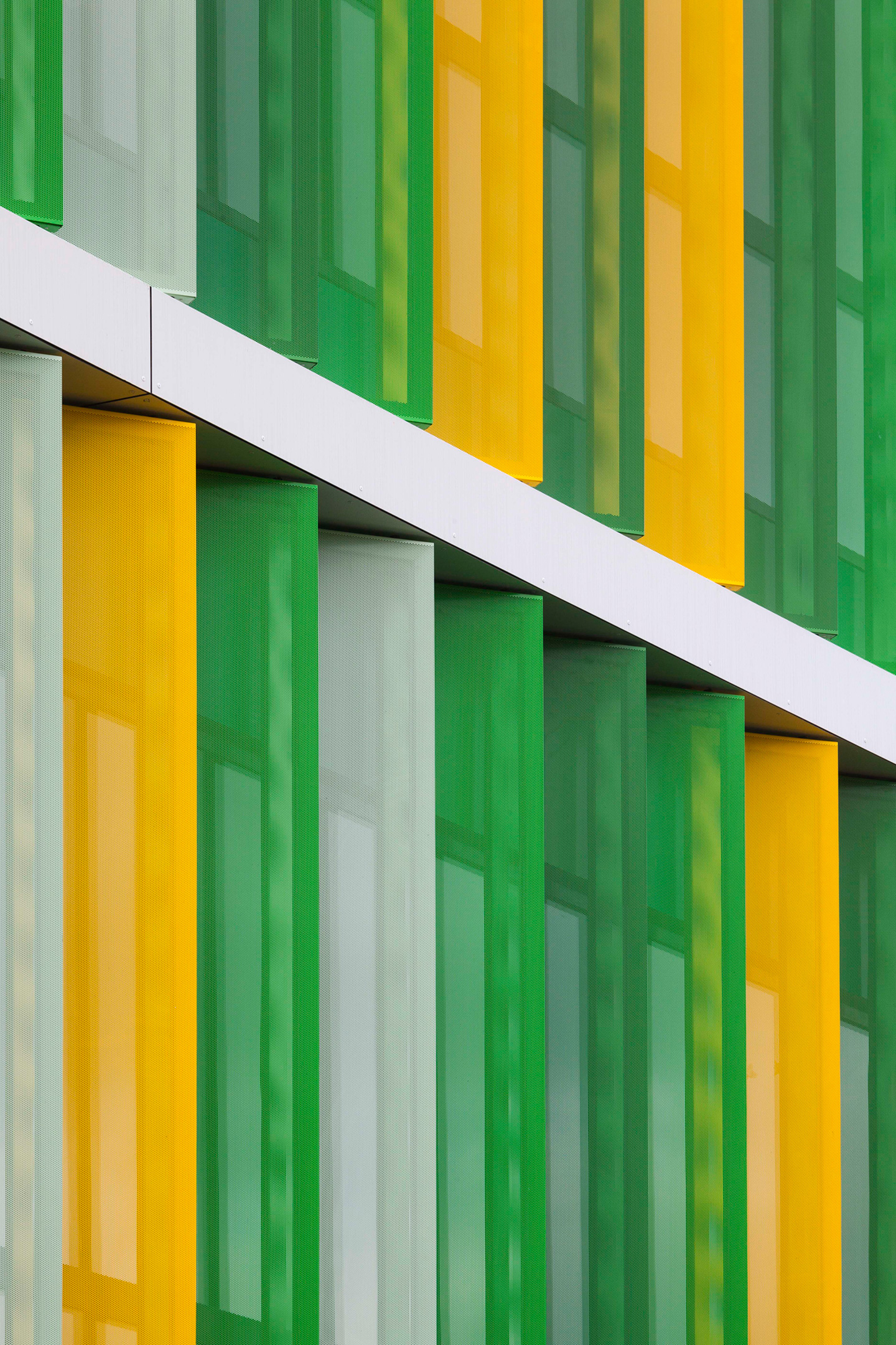Les façades sur cour, orientées au Sud-Est, sont rythmées par des brises soleil verticaux en aluminium laqué perforé. Ils composent une polychromie joyeuse en camaïeux de verts, qui anime également la façade dentrée.