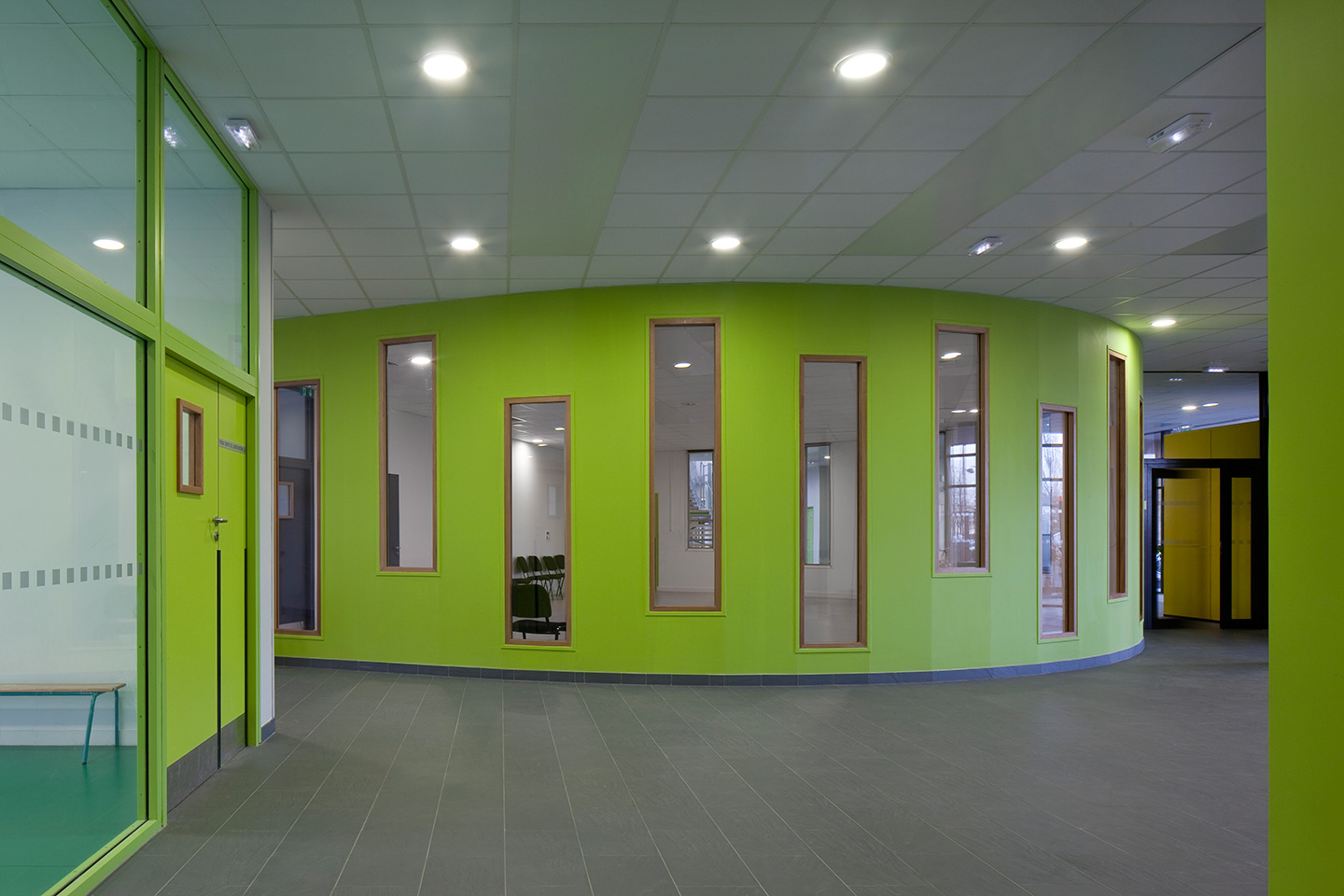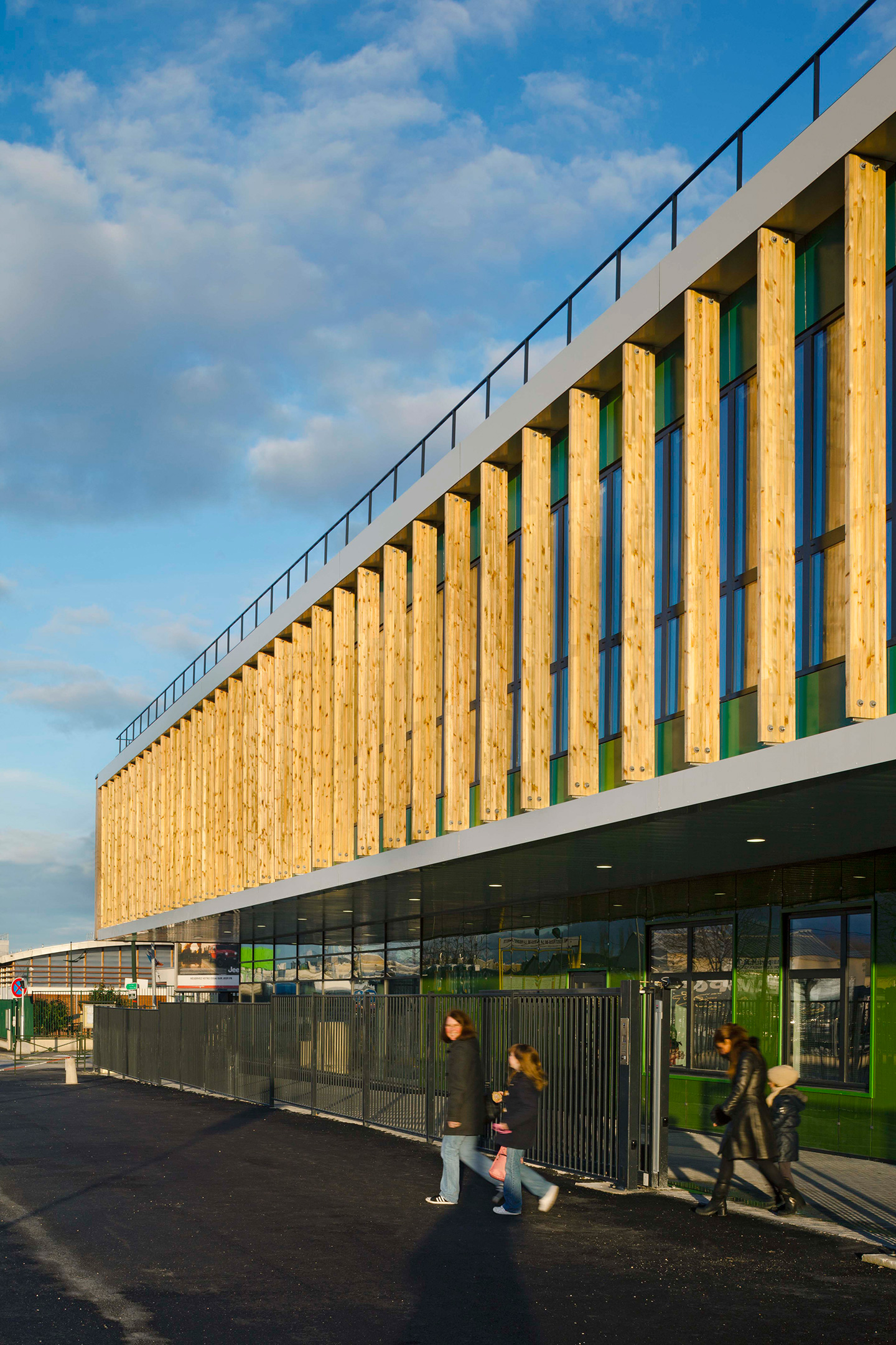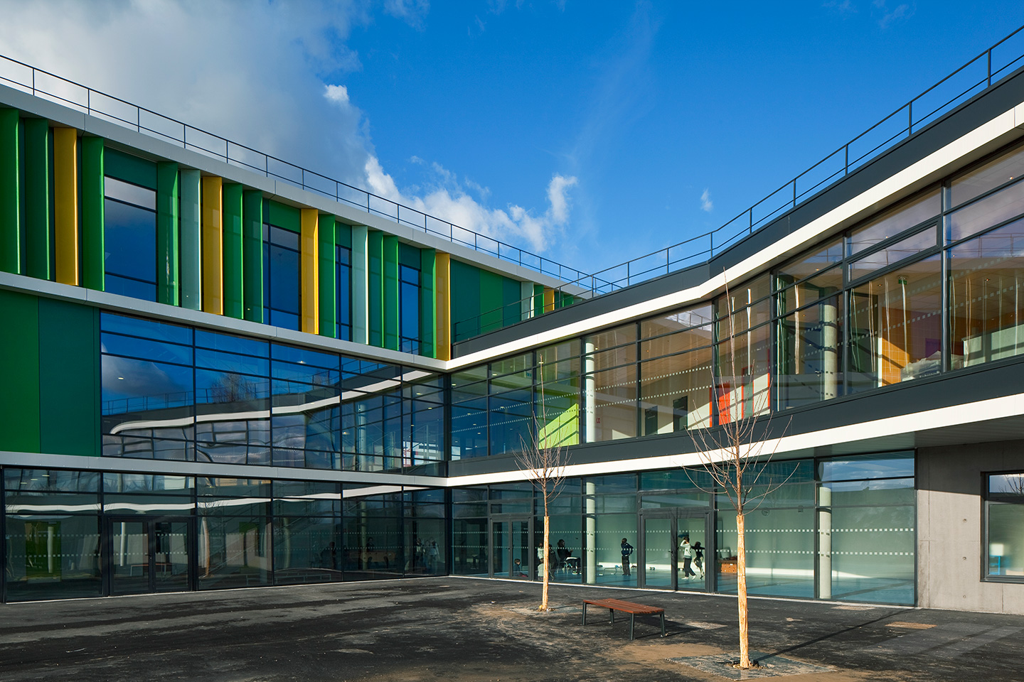 Les façades sur cour, orientées au Sud-Est, sont rythmées par des brises soleil verticaux en aluminium laqué perforé. Ils composent une polychromie joyeuse en camaïeux de verts, qui anime également la façade dentrée.